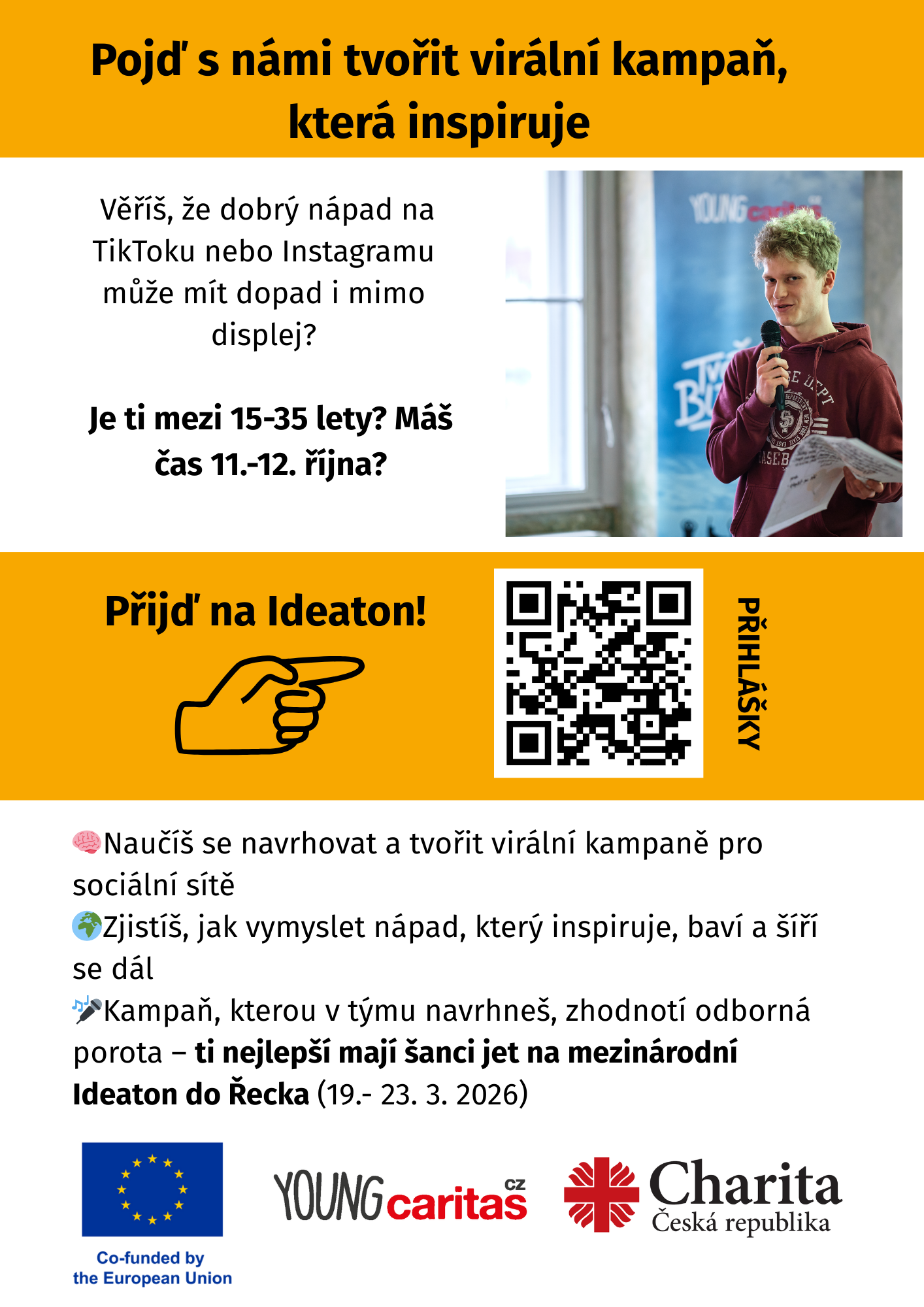 Jak uvádí oficiální stránky Young Caritas, v rámci kterého se tento projekt koná, nemusíš být influencer, abys měl/a vliv. Pokud si pohráváš s nápadem, myšlenkou, zprávou, která má potenciál ovlivnit spoustu lidí, zkus se přihlásit na Ideathon. Jedná se o říjnovou víkendovou akci, kde se naučíš navrhovat a vytvářet virální kampaně. Mimo jiné se vytrénuješ ve tvoření nápadů, které inspirují a baví ostatní, a které se budou šířit dál.