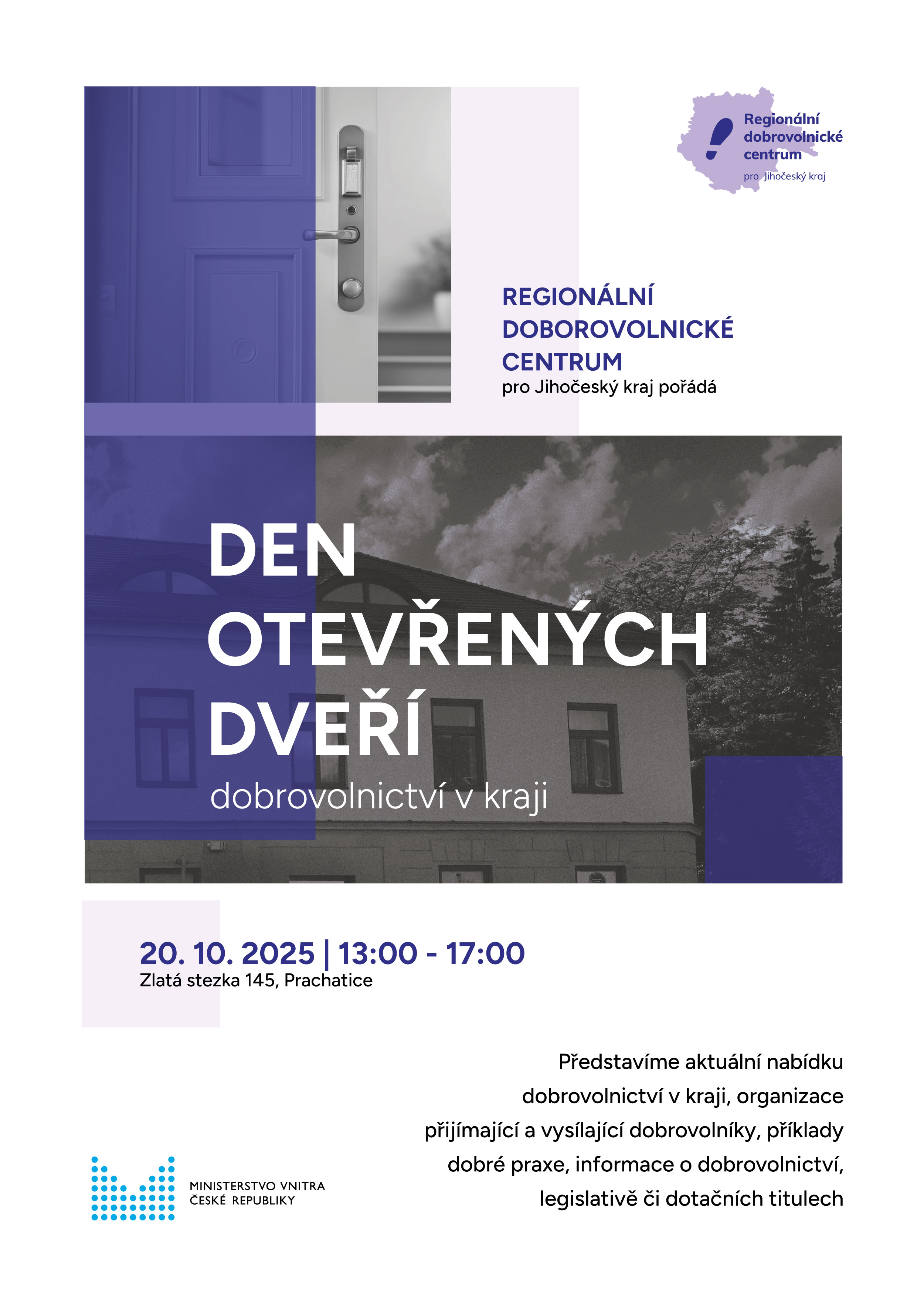 Přijďte nás navštívit a zjistěte, co všechno obnáší dobrovolnictví v Jihočeském kraji. Poznejte náš tým, zapojte se do doprovodného programu a inspirujte se příběhy lidí, kteří pomáhají tam, kde je to nejvíc potřeba.