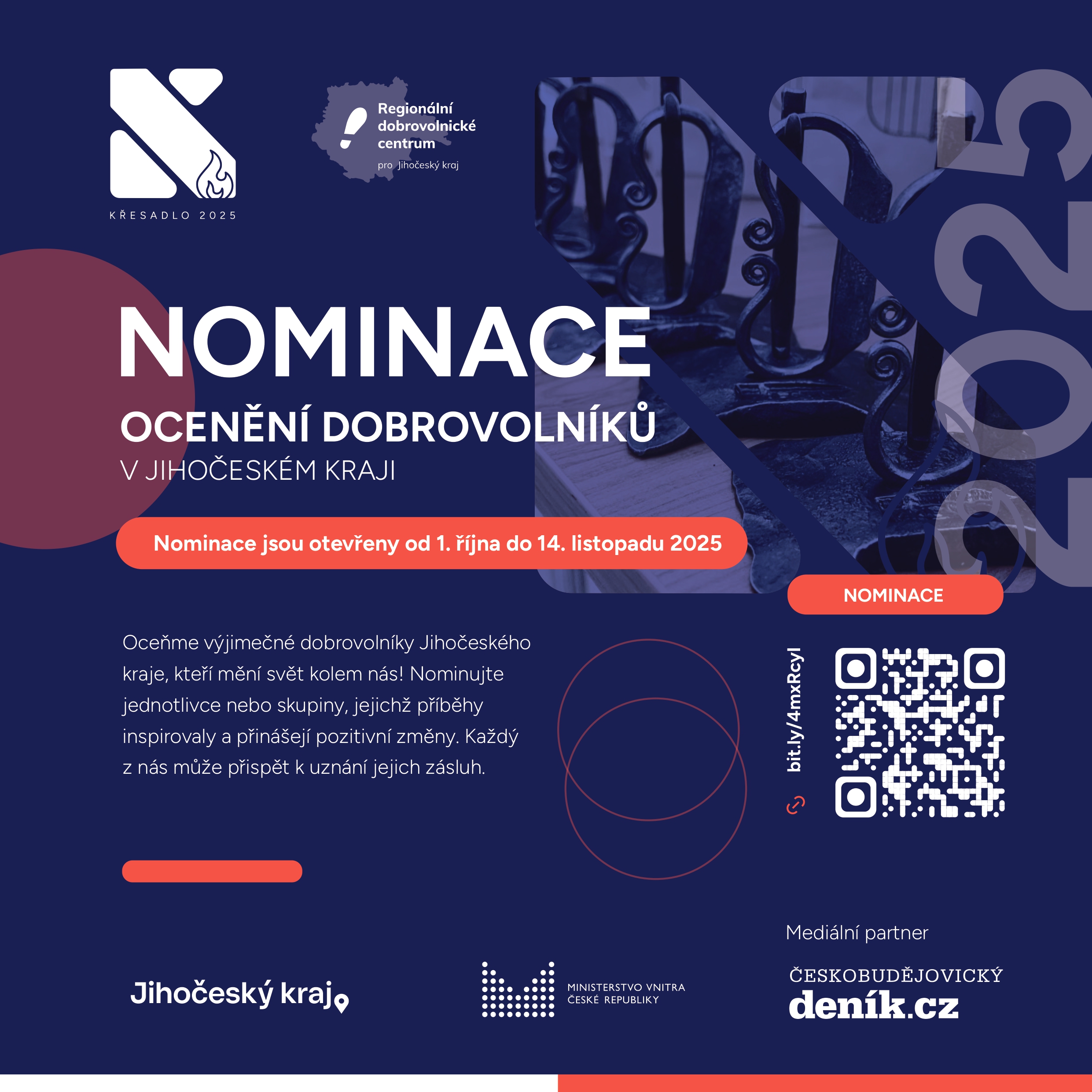 Nominace na ocenění pro dobrovolníky a jejich dobrovolnické příběhy za rok 2025 může podat jakákoliv fyzická nebo právnická osoba (tedy občan, obec, organizace). Podmínkou je, aby navrhovaný dobrovolník či parta působil v Jihočeském kraji. V nominaci je potřeba uvést základní údaje o dobrovolníkovi či partě, navrhovateli a popis činnosti dobrovolníka nebo party, zdůvodnění nominace (tedy proč má být právě on oceněn) a jeho dobrovolnický příběh. Nominovat můžete osobu či partu, která dobrovolnicky působí nebo působila v kterékoliv oblasti činnosti, kde pomáhala lidem či širšímu okolí. Může jít o činnosti vykonávané v některé organizaci, případně nezávisle a neorganizovaně. Důležitým hlediskem je, aby daná činnost byla dlouhodobá a prospěšná okolí, obci, veřejnosti, potřebným. Cena Křesadlo má za cíl ocenit dobrovolníky z Jihočeského kraje, zviditelnit dobrovolnictví (a příběhy dobrovolníků), ukázat, že dobrovolnictví má smysl a vzbudit o něj větší zájem mezi veřejností. Nominace lze zasílat prostřednictvím vyplnění online formuláře, který je dostupný nawww.rdcjk.cz v záložce Křesadlo 2025, a to od 1.10.2025 do 14. listopadu 2025 (včetně). Došlé nominace vyhodnotí odborná porota, složená ze zástupců Jihočeského kraje a odborníků v oblasti dobrovolnictví. Předání ocenění proběhne při slavnostním předání cen dne 4. prosince2025 v Barokním sále Jihočeského muzea v Českých Budějovicích. V případě dotazů využijte kontakty na vyhlašovatele – RDC JK. Kontaktní osobou je Mgr. Zdeněk Krejsa, DiS., tel. 723 123 093, e.mail: dobrovolnik@rdcjk.cz.
